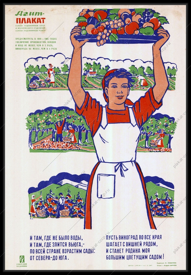 Оригинальный советский плакат увеличение производства плодов и ягод вишня виноград яблоки груши сливы фруктовые сады |