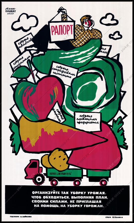 Организуйте так уборку урожая, Чтоб обходиться, выполняя план, Своими силами, не приглашая На помощь, на уборку горожан. Купить плакат СССР "Оригинальный советский плакат уборка урожая"Подарочный пакет: Оформление в раму + паспорт плаката + подарочная упаковка рамы = включен в стоимость плаката. Подробнее, о вариантах оформления и примерах работ, указано в разделе "Оформление плакатов СССР". Художник О. ЗайковаРазмер: 780/1180 мм. Стоимость : 175000.00 руб. |