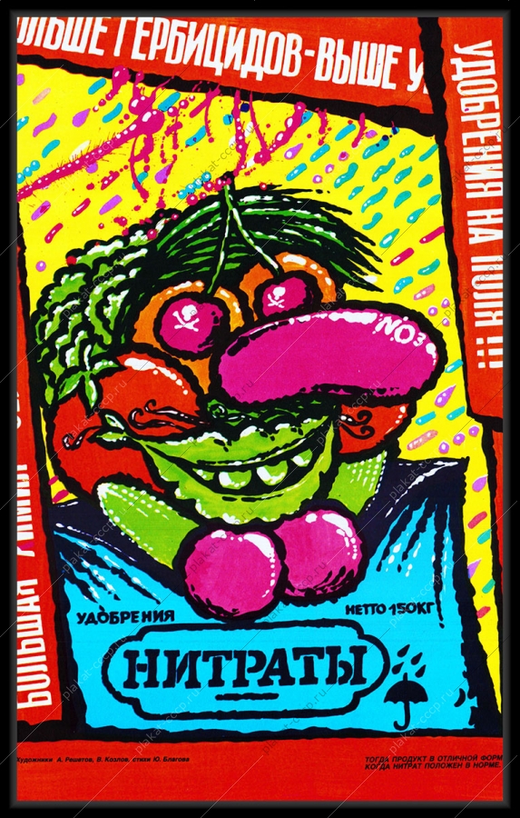 Этот плакат является ярким примером экологической и социальной сатиры позднего советского периода, когда общество начало осознавать риски интенсивной химизации сельского хозяйства. Оригинальный плакат СССР удобрения химизация нитраты