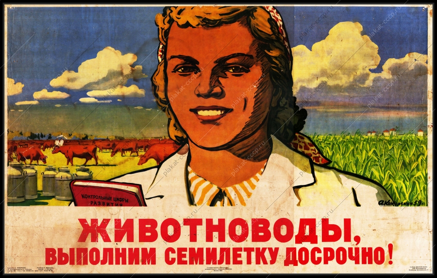 Советский плакат СССР Оригинальный советский плакат животноводы выполним семилетку досрочно животноводствоАртикул: prom_plakat_3129