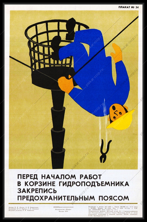 Советский плакат СССР Оригинальный плакат СССР перед началом работ в корзине гидроподъемника закрепись предохранительным поясомАртикул: prom_plakat_3333