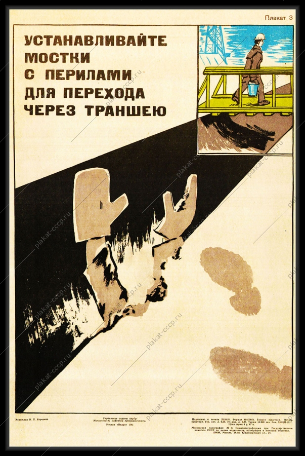 Этот советский плакат по технике безопасности призывает рабочих устанавливать мостки с перилами для перехода через траншею.