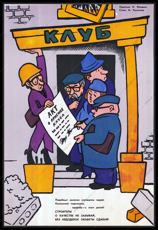 Советский плакат СССР Оригинальный плакат СССР акт о приемке клуба сдача объектов комиссии строительствоАртикул: prom_plakat_3185