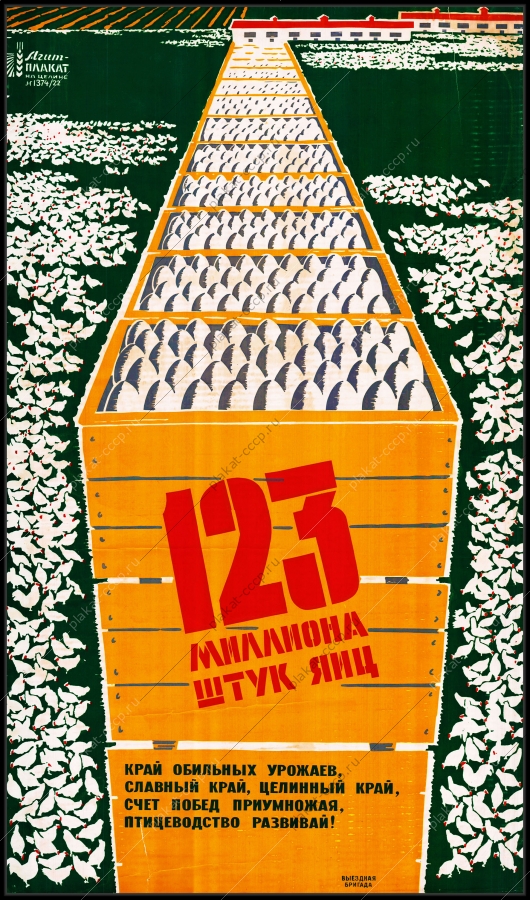 Содержание: Плакат призывает к достижению высоких показателей в производстве сельскохозяйственной продукции, в частности, ставит цель в 123 миллиона штук яиц.