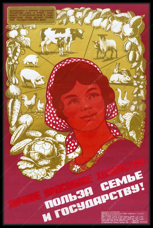 Этот советский агитационный плакат под названием «Личное подсобное хозяйство — польза семье и государству!» был создан художником А. П. Бирюковым в начале 1980-х годов (1981–1982 гг.).
