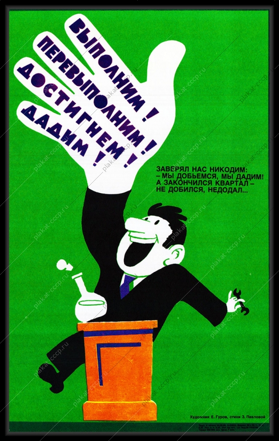 Советский плакат СССР Оригинальный плакат СССР выполнение планаЭтот советский сатирический плакат высмеивает бюрократов и пустословов, которые дают громкие обещания, но не выполняют их.