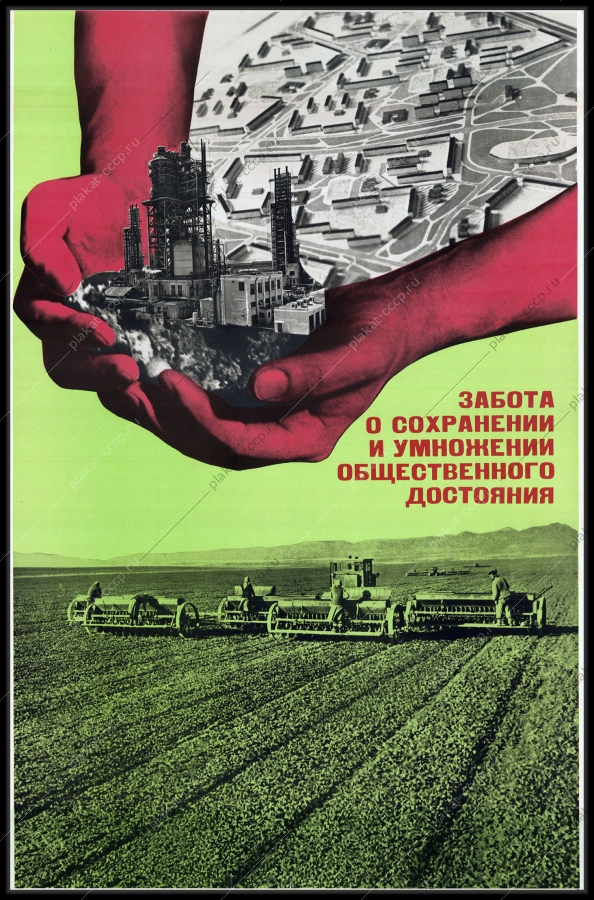 Подобные плакаты выпускались в СССР (в частности, издательством «Плакат» в 1970-е годы) для пропаганды бережливости и личной ответственности каждого гражданина за государственную собственность. Основной посыл заключался в том, что развитие промышленности и сельского хозяйства напрямую зависит от «сохранения и умножения» общих ресурсов. Оригинальный плакат СССР экономика индустриальное производство промышленный комплекс аграрный сектор сельское хозяйство
