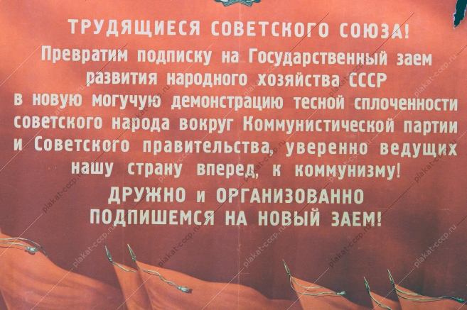 Советский плакат СССР Ф Киселев Трудящиеся Советского Союза Превратим подписку на Государственный заем развития народного хозяйства СССР в новую могучую демонстрацию тесной сплоченности советского народа вокруг Коммунистической партии и Советского правительства уверенно ведущих нашу страну вперед к коммунизму Дружно и организованно подпишемся на новый заемАртикул: rus_plakat_205