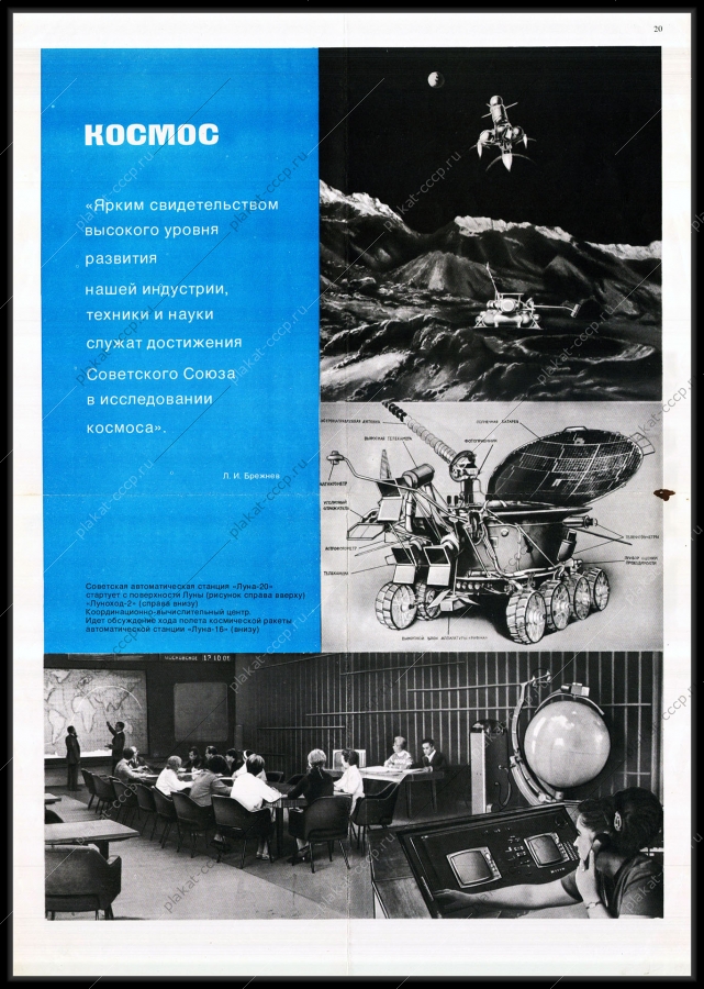 История: Автоматическая межпланетная станция «Луна-20» была запущена в феврале 1972 года и успешно доставила на Землю образцы лунного грунта. Оригинальный плакат СССР автоматическая станция Луна 20 Луноход 2 Луна 16