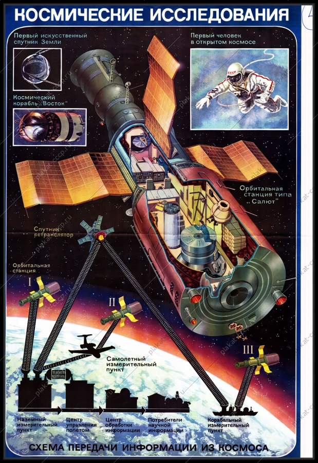 Схема передачи информации: В нижней части плаката показана схема связи, включающая наземные и корабельные измерительные пункты, самолетный измерительный пункт, спутники-ретрансляторы, Центр управления полетом и Центр обработки информации. Оригинальный плакат СССР космические исследования схема передачи информации из космоса