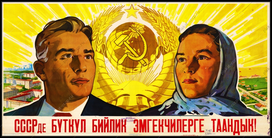 Надпись: Текст на плакате написан на киргизском языке и гласит: СССРде бткл бийлик эмгекчилерге таандык, что переводится как Вся власть в СССР принадлежит трудящимся.