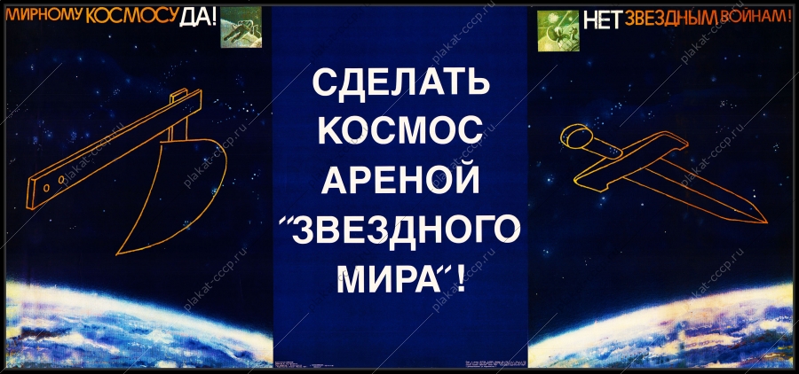 Исторический фон: Плакат был создан в эпоху «перестройки», когда СССР активно выступал против американской программы «Стратегическая оборонная инициатива» (СОИ), получившей в прессе название «Звездные войны». Оригинальный плакат СССР нет звездным войнам сделать космос ареной звездного мира