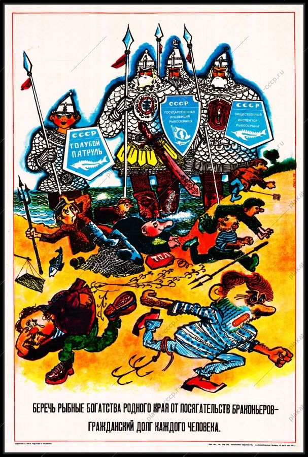 Сюжет: В карикатурной форме изображены «богатыри» в кольчугах и шлемах (инспекторы рыбоохраны и общественники), которые на берегу водоема сражаются с мелкими, жадными браконьерами, использующими сети, остроги и другие запрещенные средства лова.