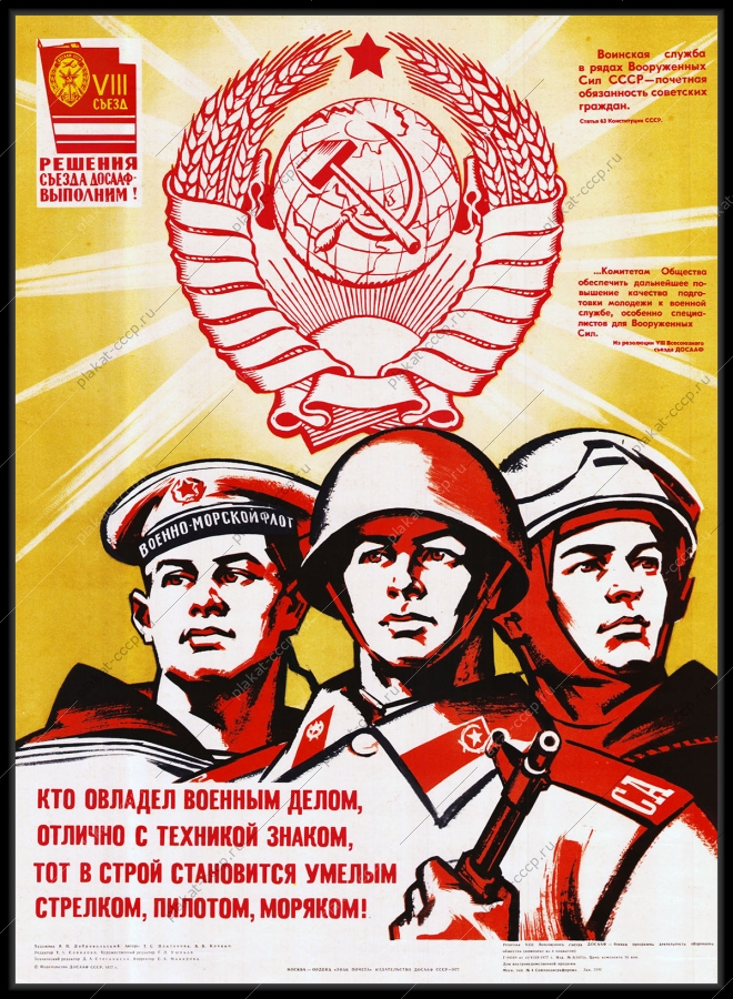 ДОСААФ СССР - школа патриотов! Главной задачей организации ДОСААФ и впредь остается содействие укреплению обороноспособности страны и подготовке трудящихся, особенно молодежи, к защите социалистического Отечества. Наш лозунг должен быть таким - учиться военному делу настоящим образом. В.И. Ленин 1979 Купить плакат СССР "Оригинальный военный плакат СССР ДОСААФ школа патриотов резервисты 1979"Подарочный пакет: Оформление в раму + паспорт плаката + подарочная упаковка рамы = включен в стоимость плаката. Подробнее, о вариантах оформления и примерах работ, указано в разделе "Оформление плакатов СССР". Ордена "Знак почета" издательство ДОСААФ СССР - 1979Художник К. М. Кузгинов Тираж 47 000 экз. Московская типография № 4 Союзполиграфпрома при Государственном комитете СССР по делам издательств, полиграфии и книжной торговли Москва, 129041, Б. Переяславская ул., д.46 Размер: 400/600 мм. Стоимость : 135000.00 руб. |