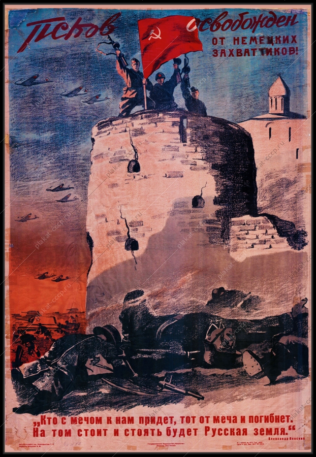 Этот плакат посвящен освобождению Пскова от немецко-фашистских захватчиков, которое произошло 23 июля 1944 года.