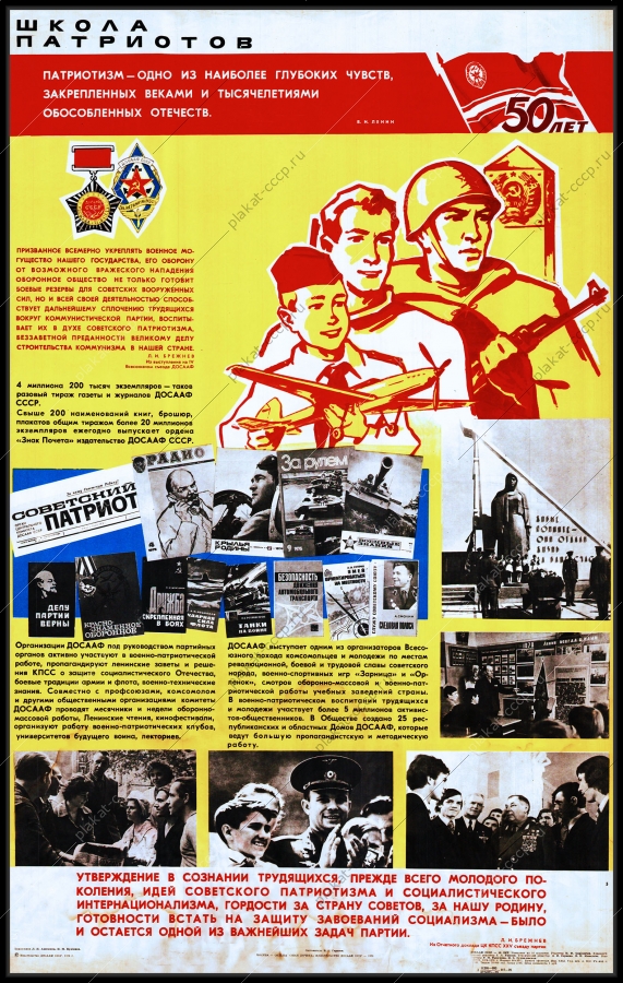 Советский плакат СССР Оригинальный плакат СССР школа патриотов патриотизмЭтот плакат называется Школа патриотов и посвящен 50-летию ДОСААФ СССР (Добровольное общество содействия армии, авиации и флоту), которое отмечалось в 1977 году.