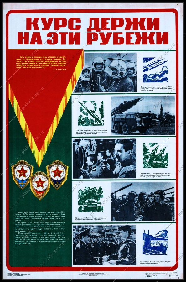 Такие плакаты выпускались издательством «Плакат» (Москва) крупными тиражами для размещения в казармах, ленинских комнатах и учебных классах воинских частей. Оригинальный плакат СССР курс держи на эти рубежи советская армия